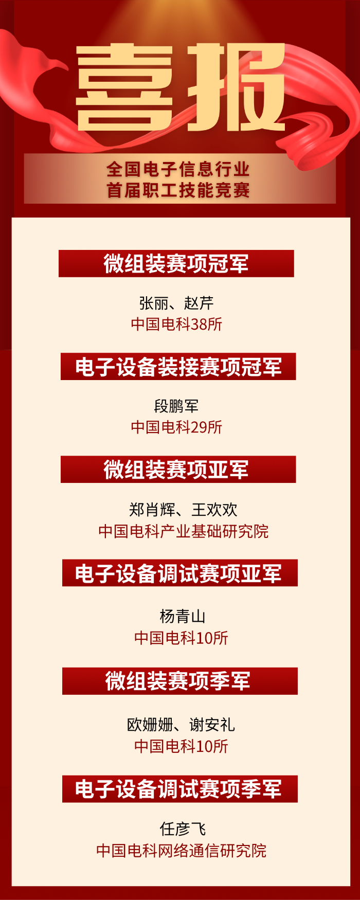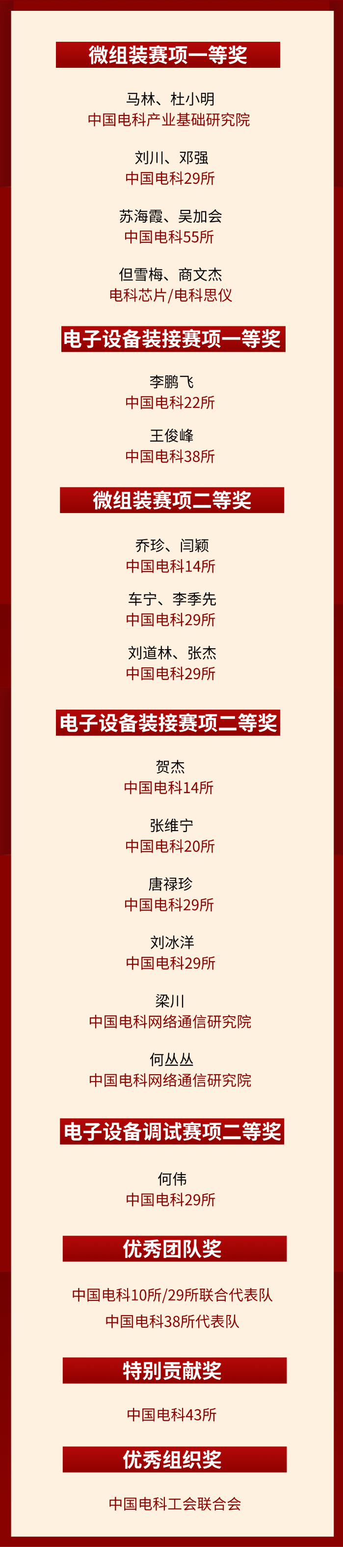 其中,中国电科9名职工荣获冠、亚、季军,2个代表队获优秀团队奖,23名职工分获一、二等奖。此外,中国电科43所荣获特别贡献奖,中国电科工会联合会荣获优秀组织奖。