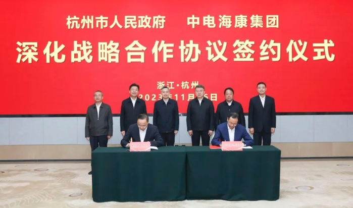 11月16日,中电海康与杭州市政府签订深化战略合作协议。浙江省委副书记、杭州市委书记刘捷,中国电科党组书记、董事长王海波出席签约仪式并讲话。杭州市委副书记、市长姚高员主持签约仪式,杭州市副市长孙旭东,中国电科副总经理杨军,中国电科总经理助理、中电海康董事长陈宗年参加仪式。